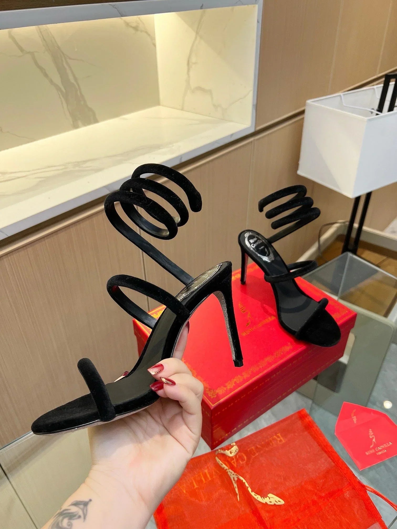 Bold and glamorous high-heel sandals designed with a sleek square-toe silhouette and distinctive spiral ankle straps. Finished in a high-shine fuchsia tone, they add a vibrant, statement-making touch to parties, events, and evening outings.
